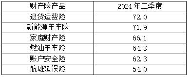 二季度对六类常见财产保险产品的消费者购买意愿调查显示,退货运费险、新能源车车险、家庭财产险、燃油车车险、账户安全险、航班延误险等六类保险产品的购买意愿指数大于50,处于意愿较积极区间,前三位分别是: